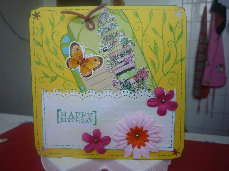 Материалы: акварельная бумага, офисная бумага ("затонирована" чуть-чуть желтым цветом по всей поверхности ну и опять с моим тиснением точками), цветы Kaisercraft + из нового набора. Полубусинки и наклейка бабочка...